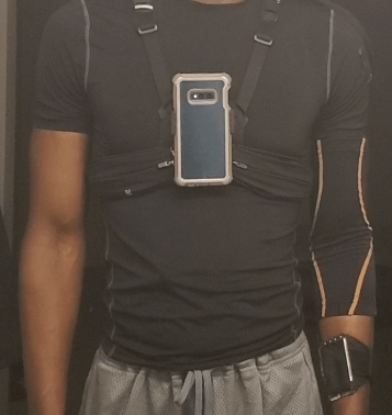 I cut out a hard, flexible, piece of plastic from a container, sewed the top straps of the Fitly backpack to it. Then I have the front straps attached to the bottom of the phone holder with Velcro. The magnetic piece Fitly used were not strong enough to hold together with the weight of the phone. I fastened a smartphone clamp from one of those suction phone holders that go into cars. Its turned out to be pretty stable, after some modifications, when running. You can see in the picture the arm sleeve above the display. I using that to keep the cord running down to that from flying around. Running it down the back of the arm gives me complete range of motion without pulling the cord. Plus its more difficult for it to get snagged on something.