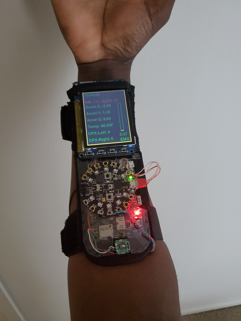 There are several sensors displaying on the screen in the image above. The circuit playground on top is attached with velcro. Its sending temperature, accelerometer, button states, and EMG data. The EMG sensor, by Myoware is attached underneath, by velcro, where its pads connect to my skin.