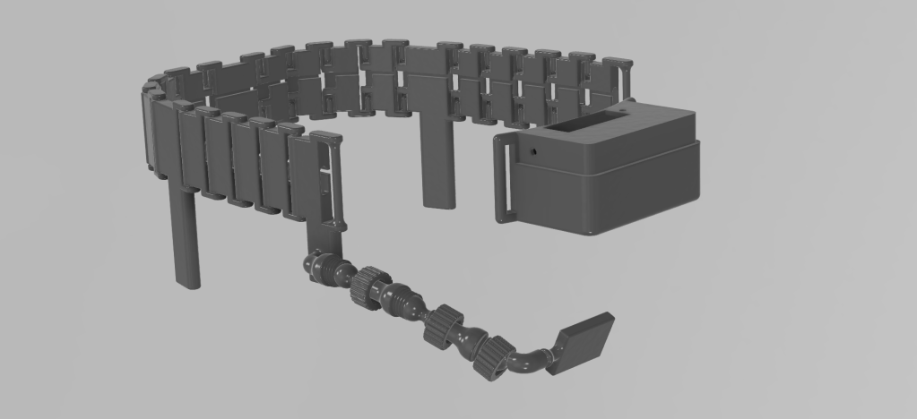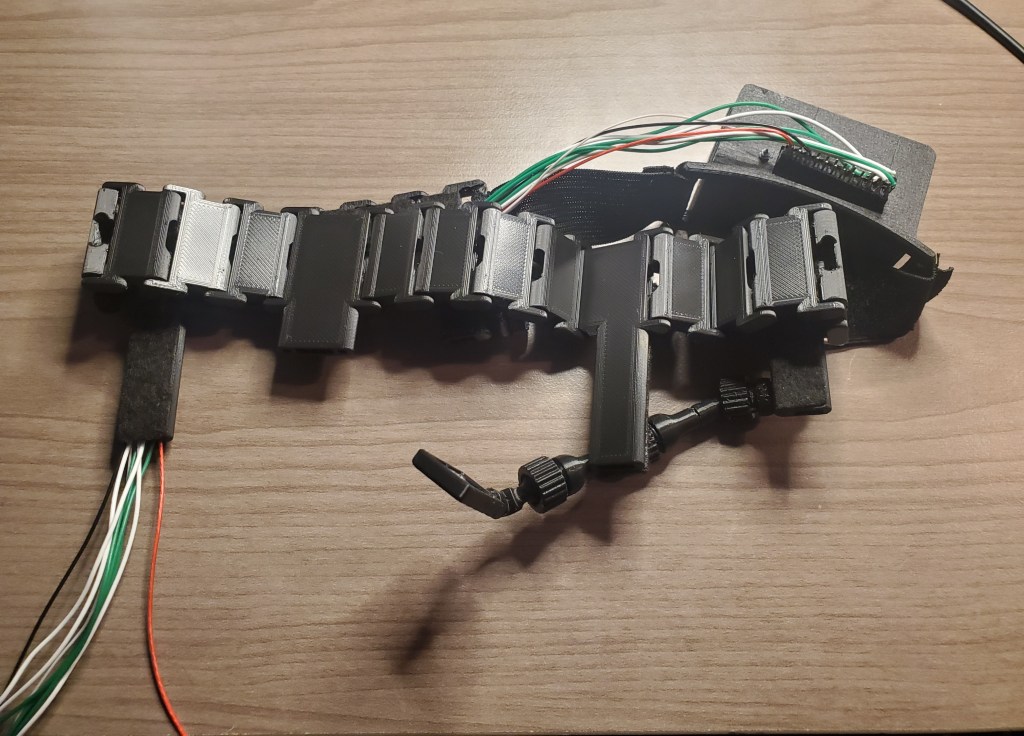 I designed these detachable link pieces to form a belt around the head. Each link has a little more than 180° articulation. They have hollow space in the middle to feed the wires through. For my head I needed two temple pieces, two behind the ear pieces, one back piece, and 16 small pieces.