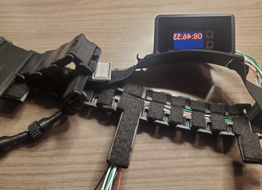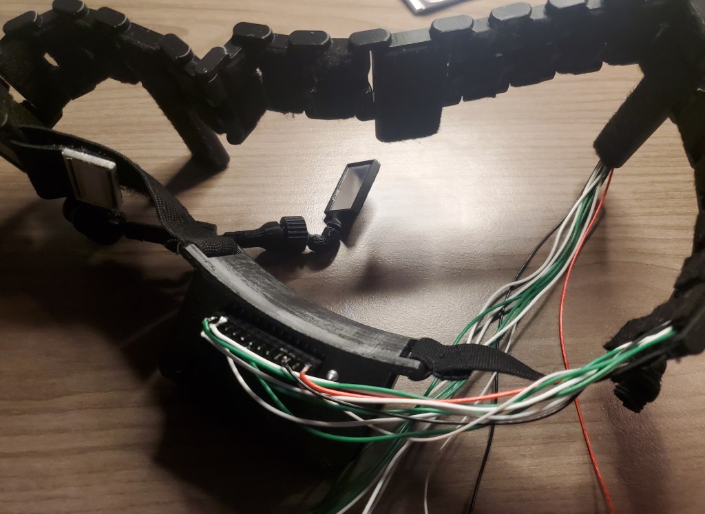 I originally wanted the wires to come out the back piece but my wires were to short, so I have them coming out the behind the ear piece. The forehead piece where the display is protrudes past the display to block light.