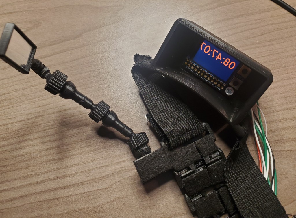 The mirror holder was the hardest part to design. I wanted it to be adjustable to have the display at different positions in my eyesight. I orignally had a thin gooseneck arm attached to the mirror, but it was too weak to hold its position when I moved. This design has ball and socket links with threaded caps to tighten them.
