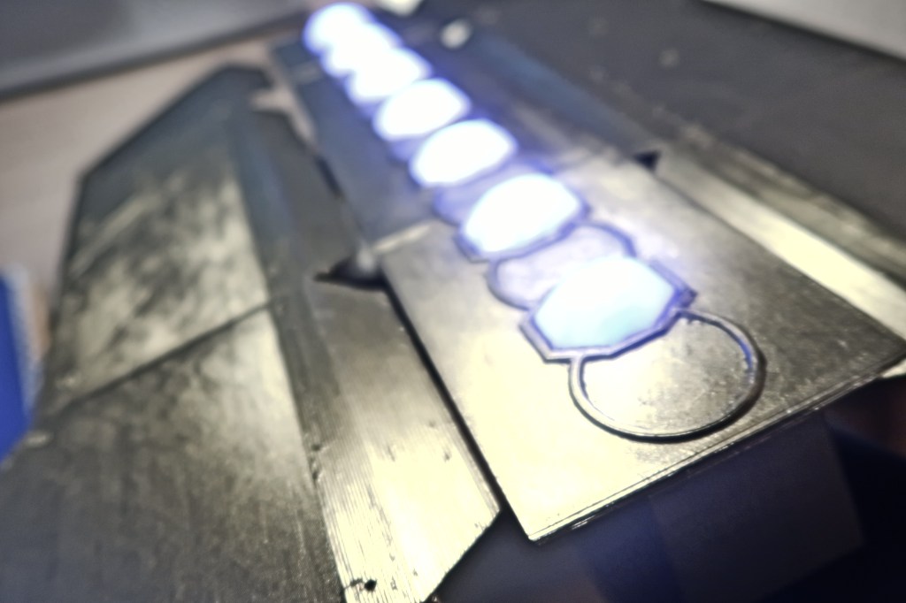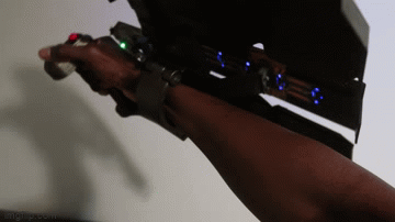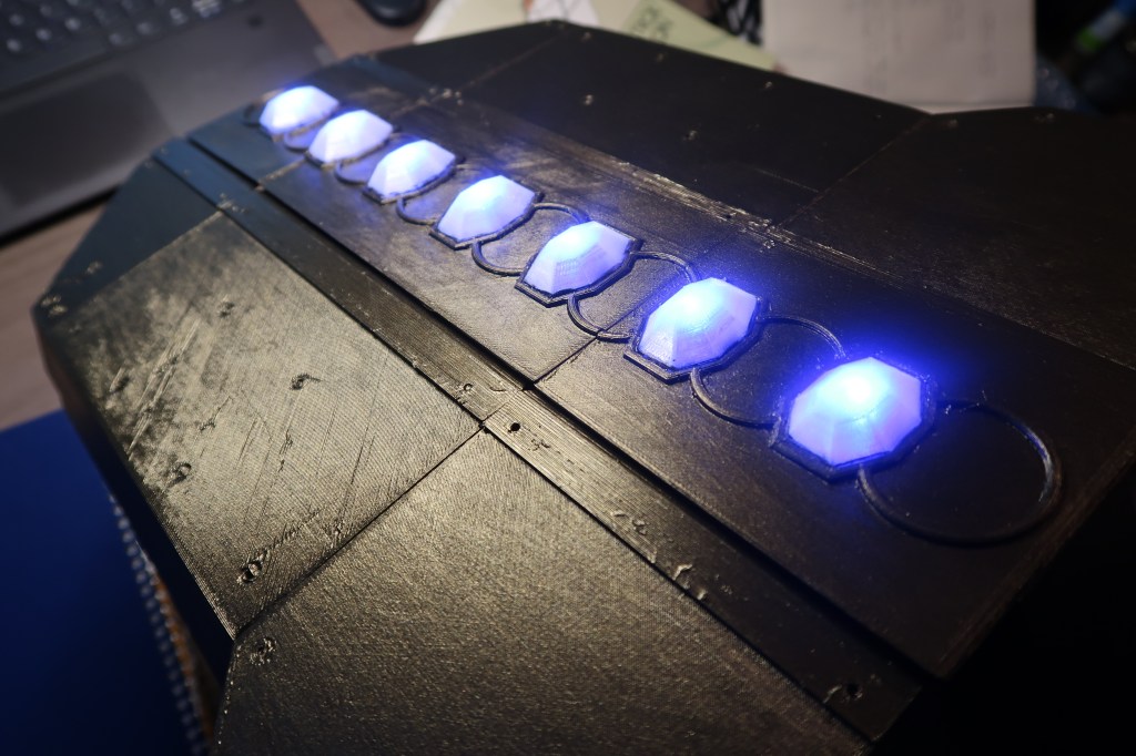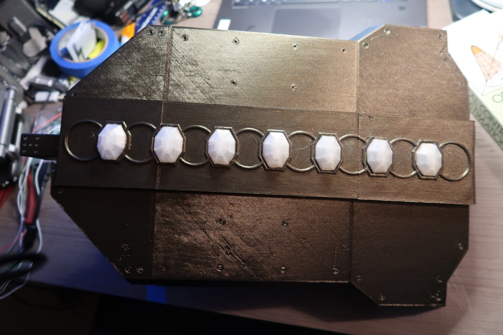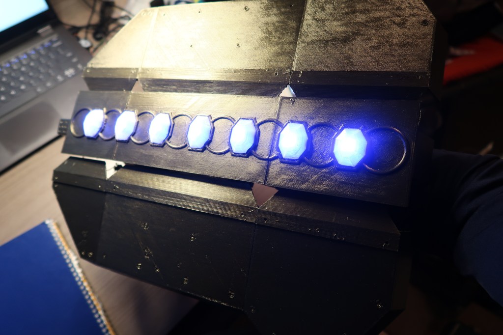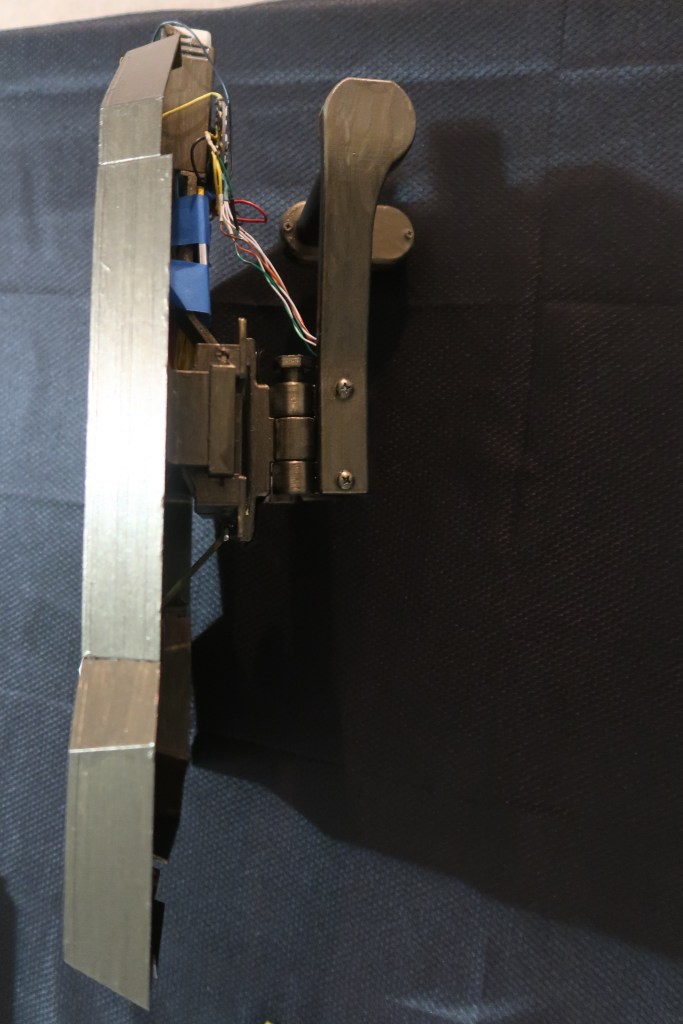 The shield has a continuous servo motor gear box that move the two halves of the shield in and out with the press of two of the buttons on the handle. The other button, triggers the NeoPixel gems to change color and the blaster tip the glow red. The trigger button also plays a blaster sound.