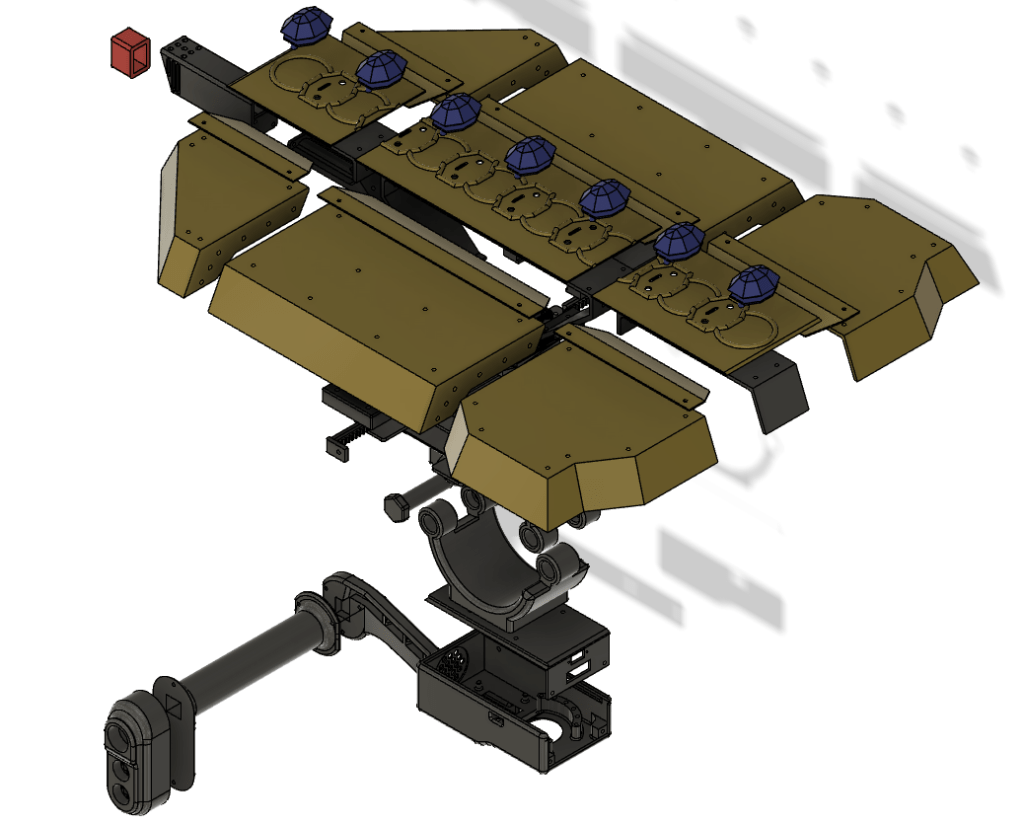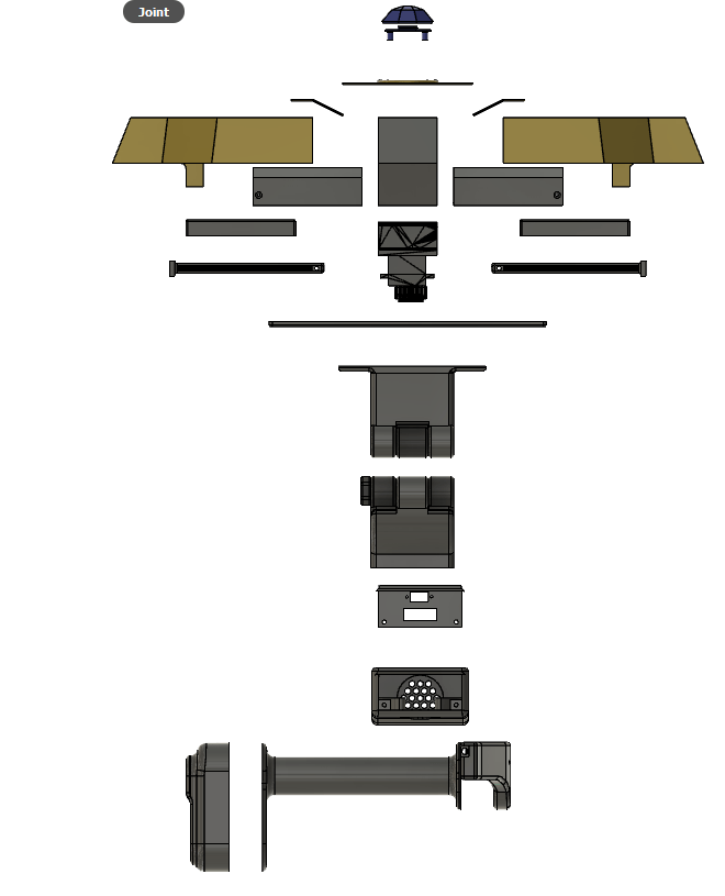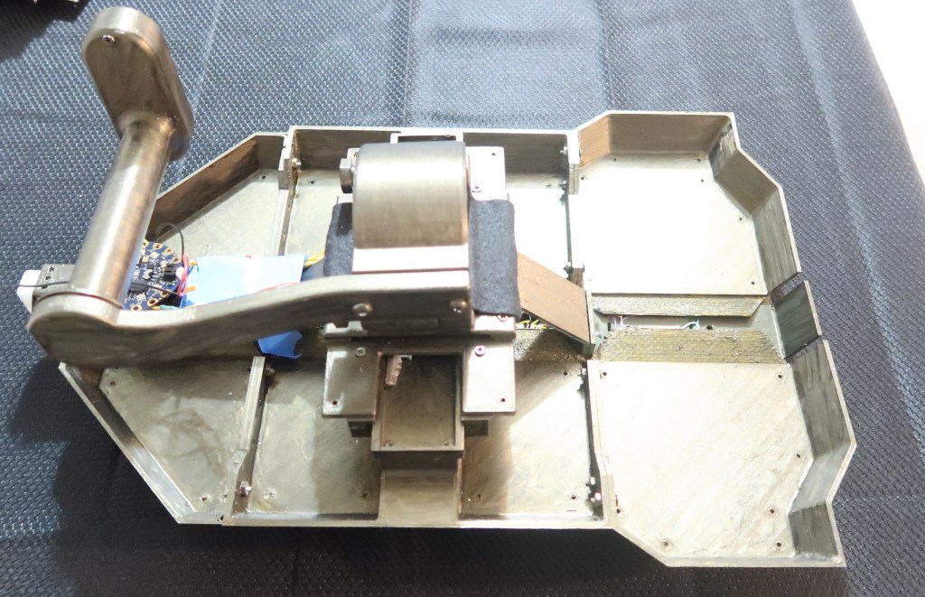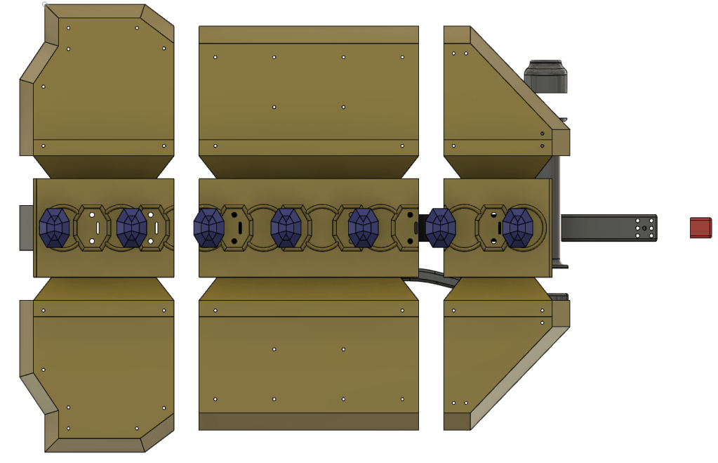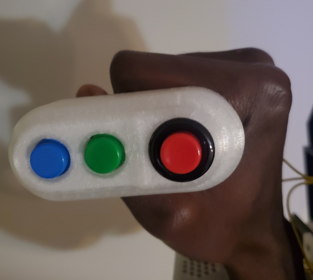 The shield has a continuous servo motor gear box that move the two halves of the shield in and out with the press of two of the buttons on the handle. The other button, triggers the NeoPixel gems to change color and the blaster tip the glow red. The trigger button also plays a blaster sound.