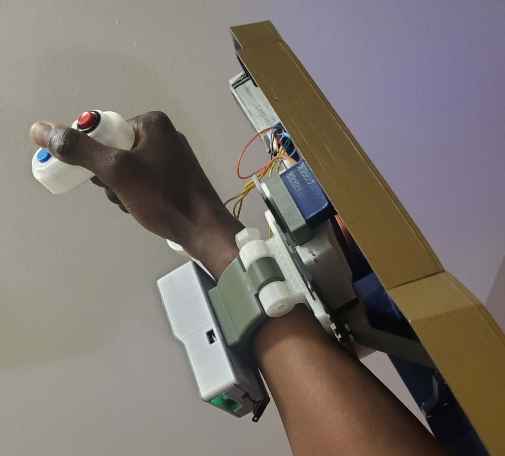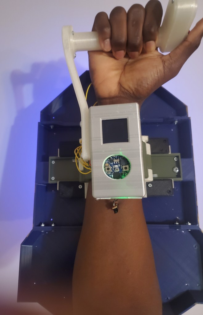I’m using Adafruit’s Circuit Playground BLE, which has a small speaker and amplifier on the board, with a LiPo battery. My original design uses Adafruit’s Circuit Playground TFT Gizmo and an external speaker all enclosed in a module that sits on the other side of the wrist. A battery also in within the enclosure.